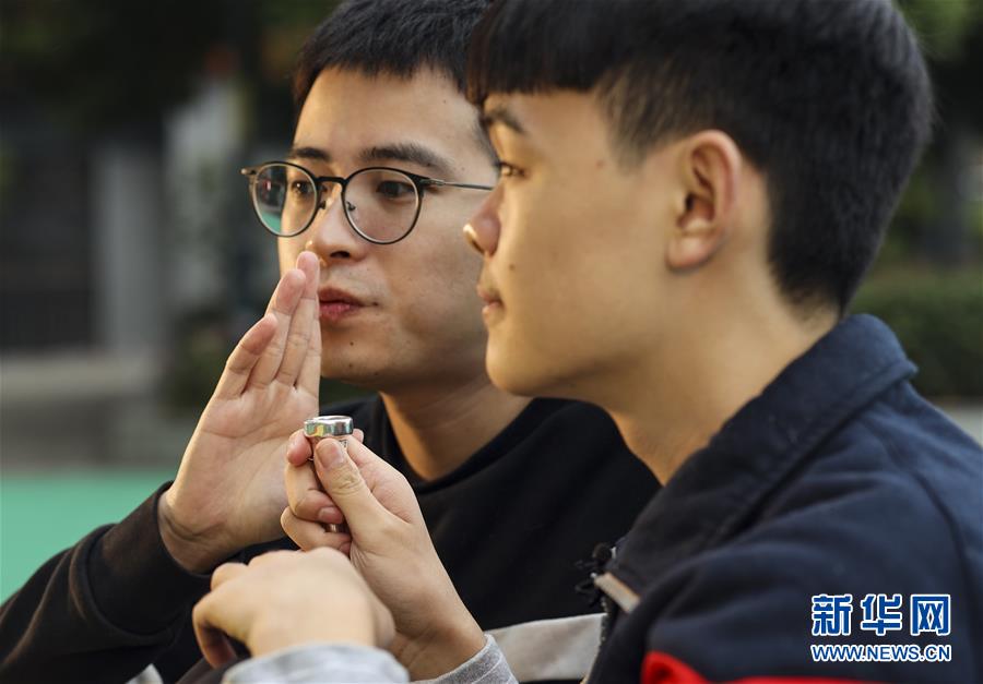 重慶市特殊教育中心的老師李沂念(左一)在教授盲童王太樊練習(xí)小號(hào)(10月10日攝)。 新華社記者 劉潺 攝