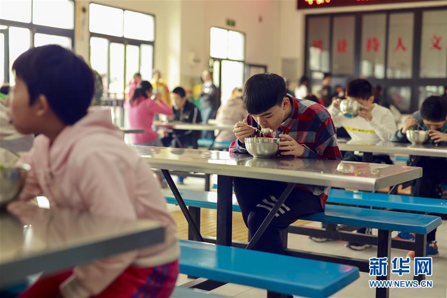 王太樊在學(xué)校食堂內(nèi)吃午飯(10月10日攝)。 新華社記者 劉潺 攝