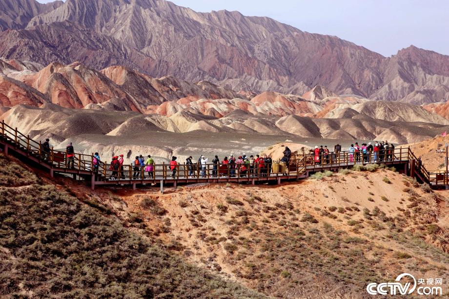 央視網(wǎng)消息:2019年10月15日,金秋時(shí)節(jié),位于甘肅省張掖市臨澤縣的七彩丹霞景區(qū)進(jìn)入旅游旺季,吸引眾多游人紛至沓來(lái)。張掖七彩丹霞景區(qū),分布面積約50公里,是中國(guó)北方干旱地區(qū)發(fā)育最典型的丹霞地貌。在方圓數(shù)十平方公里的范圍內(nèi),隨處可見有紅、黃、橙、綠、白等多種鮮艷的色塊或線條,把一座座山峰,一條條溝壑,裝點(diǎn)成一幅幅絢麗多姿、燦爛奪目的畫圖。圖片來(lái)源:視覺中國(guó)