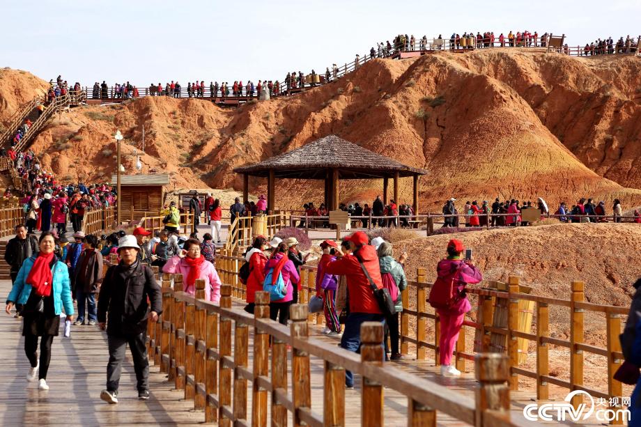 央視網(wǎng)消息:2019年10月15日,金秋時(shí)節(jié),位于甘肅省張掖市臨澤縣的七彩丹霞景區(qū)進(jìn)入旅游旺季,吸引眾多游人紛至沓來(lái)。張掖七彩丹霞景區(qū),分布面積約50公里,是中國(guó)北方干旱地區(qū)發(fā)育最典型的丹霞地貌。在方圓數(shù)十平方公里的范圍內(nèi),隨處可見(jiàn)有紅、黃、橙、綠、白等多種鮮艷的色塊或線條,把一座座山峰,一條條溝壑,裝點(diǎn)成一幅幅絢麗多姿、燦爛奪目的畫(huà)圖。圖片來(lái)源:視覺(jué)中國(guó)