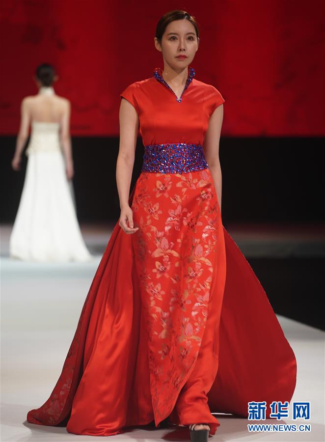 10月16日,模特在展示婚慶禮服。 當(dāng)日,“愿·緣·圓”上久楷婚慶主題秀在江蘇省蘇州市吳江區(qū)盛澤鎮(zhèn)舉行。 新華社記者 季春鵬 攝