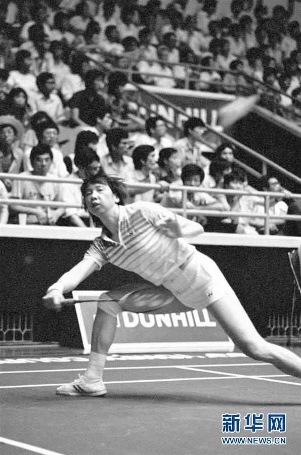 圖為韓愛(ài)萍在福州舉行的1986年“登喜路”中國(guó)羽毛球公開(kāi)賽女子單打決賽中擊球(1986年6月1日攝),她最終奪得女單冠軍。新華社記者官天一攝