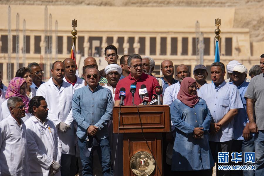 10月19日,在埃及盧克索,埃及文物部長哈立德·阿納尼在新聞發(fā)布會上講話。 埃及文物部19日在南部城市盧克索舉行的新聞發(fā)布會上宣布,埃及考古隊(duì)近期發(fā)掘出30具3000年前的木質(zhì)棺槨。 新華社記者 李碧念 攝