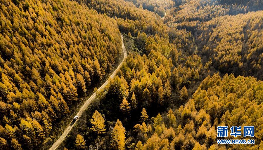 10月8日,一輛汽車行駛在好地方林場的林間道路上(無人機(jī)拍攝)。新華社記者陶明攝