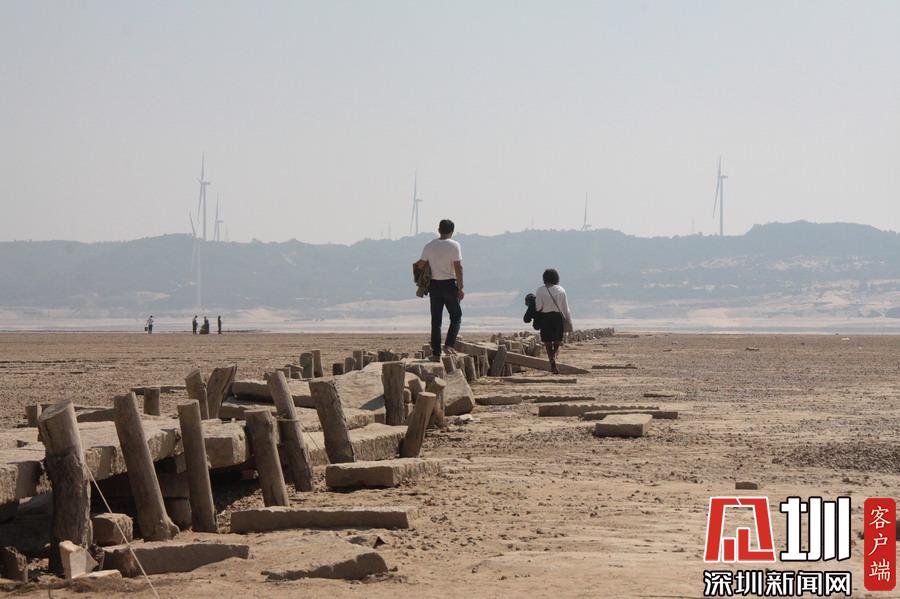 10月9日,江西省廬山市,游客行走在鄱陽湖湖區(qū)干涸的湖面上。新華社記者胡晨歡攝