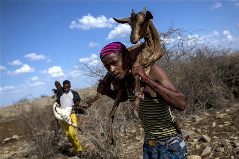 當?shù)貢r間2016年12月15日,索馬里邦特蘭,干旱的土地上散布著羊的尸體。當?shù)卦庥龈珊堤鞖?,牲畜受到危害?/p>