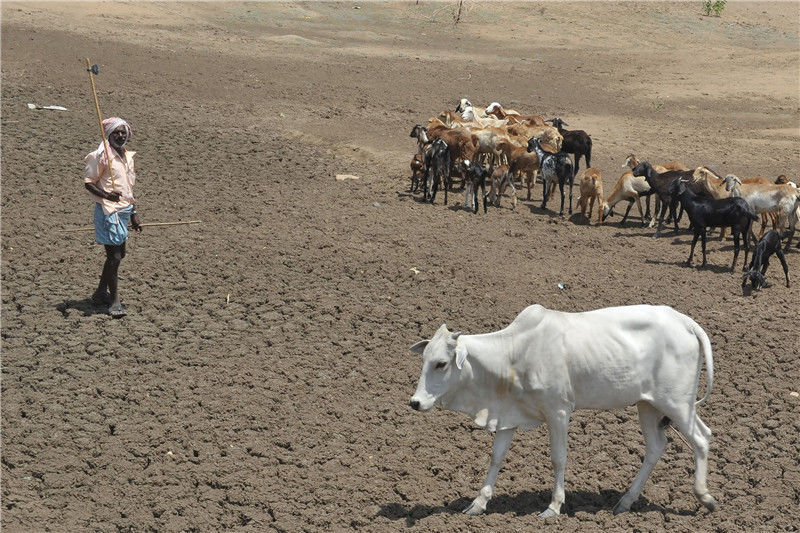 當(dāng)?shù)貢r(shí)間2017年5月30日,印度特倫甘納,印度農(nóng)民在干涸的河床上放羊和牛。NOAH SEELAM/視覺中國編輯/陳進(jìn)