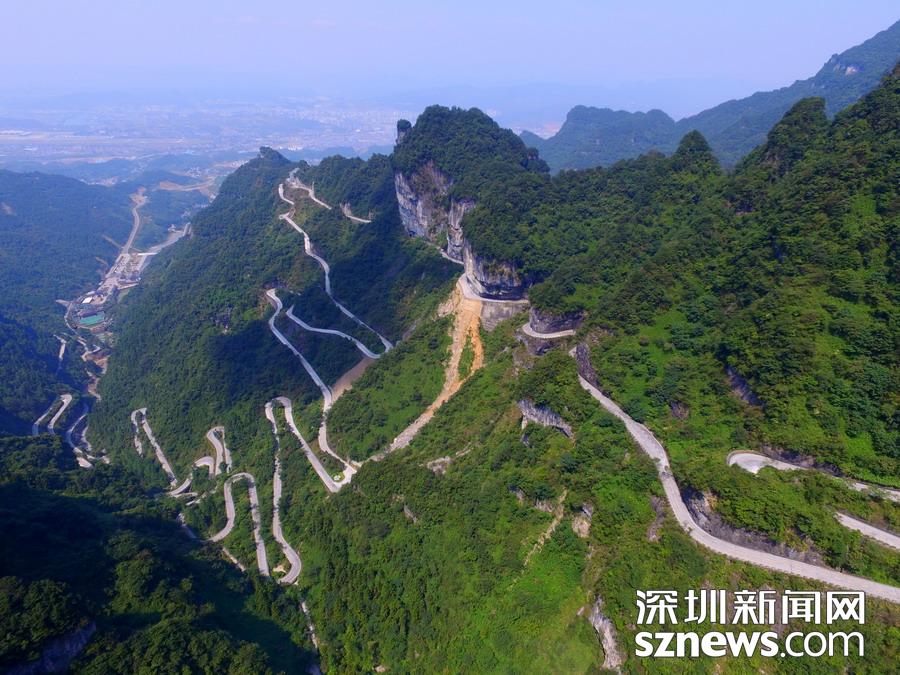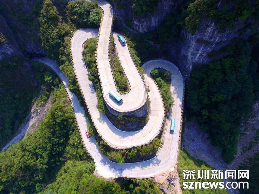 天門山盤山公路位于湖南省張家界市境內(nèi)的國家森林公園天門山上,盤山公路全長10.77公里,海拔從200米急劇提升到1300米,大道兩側(cè)絕壁千仞,空谷幽深,共計99個彎,180度急彎此消彼長,似玉帶環(huán)繞,航拍鏡頭下蜿蜒曲折的道路彎彎緊連,層層迭起,宛如迷宮般的“納斯卡線條”,被譽為“天下第一公路奇觀”,同時它也是世界上最危險的十大公路之一。