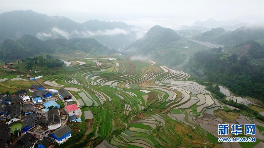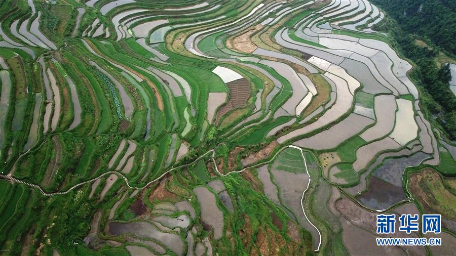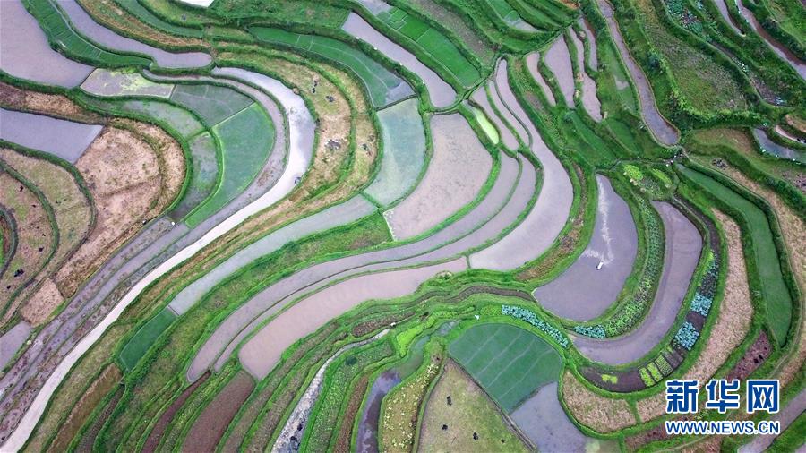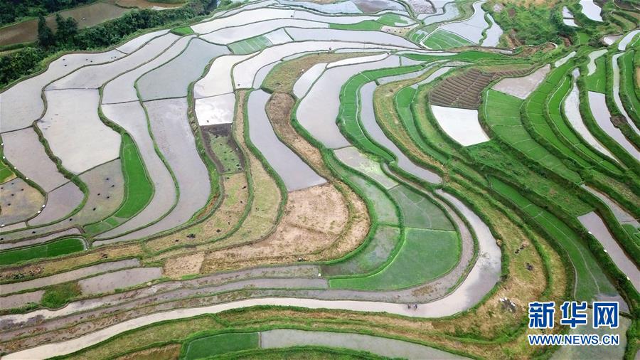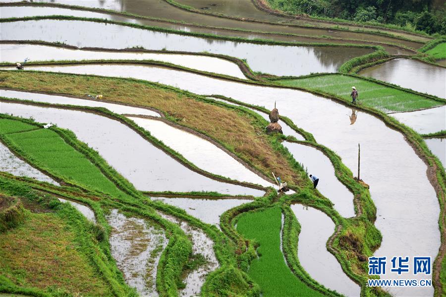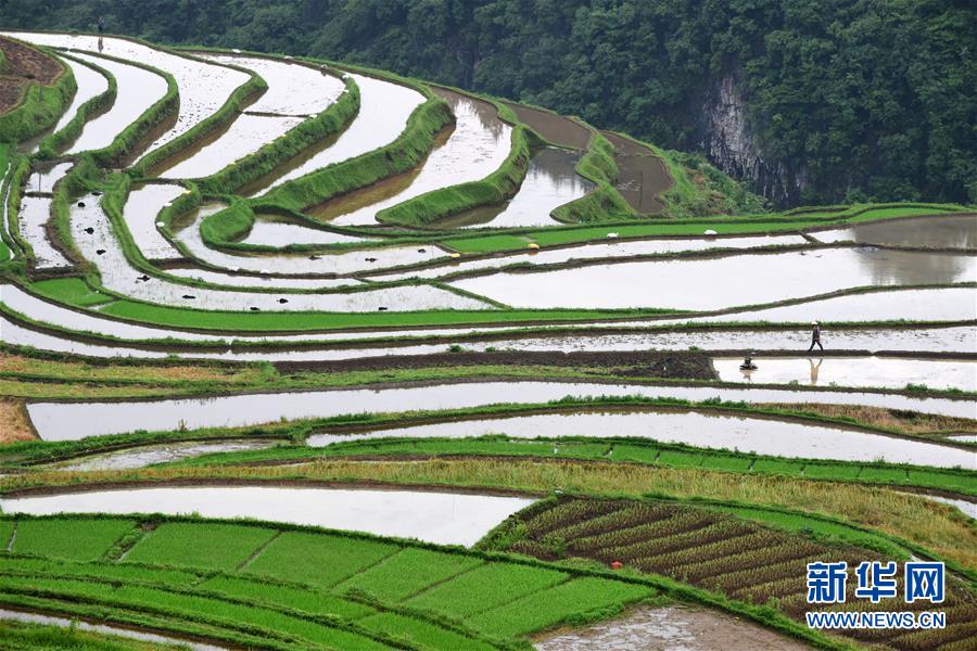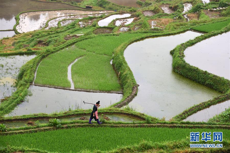 5月18日,農(nóng)民在貴州省丹寨縣龍泉鎮(zhèn)高要梯田里勞作。初夏時節(jié),位于貴州省丹寨縣龍泉鎮(zhèn)的高要梯田景色優(yōu)美。新華社記者楊文斌攝