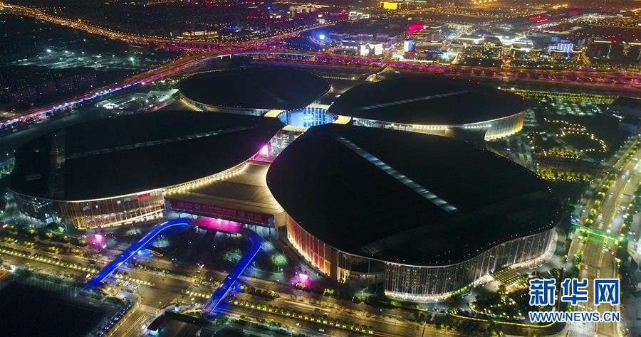 2019年11月5日,第二屆中國國際進口博覽會將在上海開幕。夜幕下的國家會展中心(上海)燈光璀璨,流光溢彩,靜待八方賓客。新華社記者丁汀攝