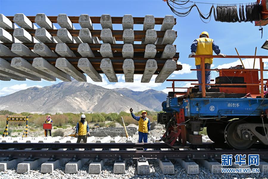 6月6日,負(fù)責(zé)鋪軌的中鐵十一局集團(tuán)的建設(shè)者在現(xiàn)場(chǎng)作業(yè)。新華社記者李鑫攝