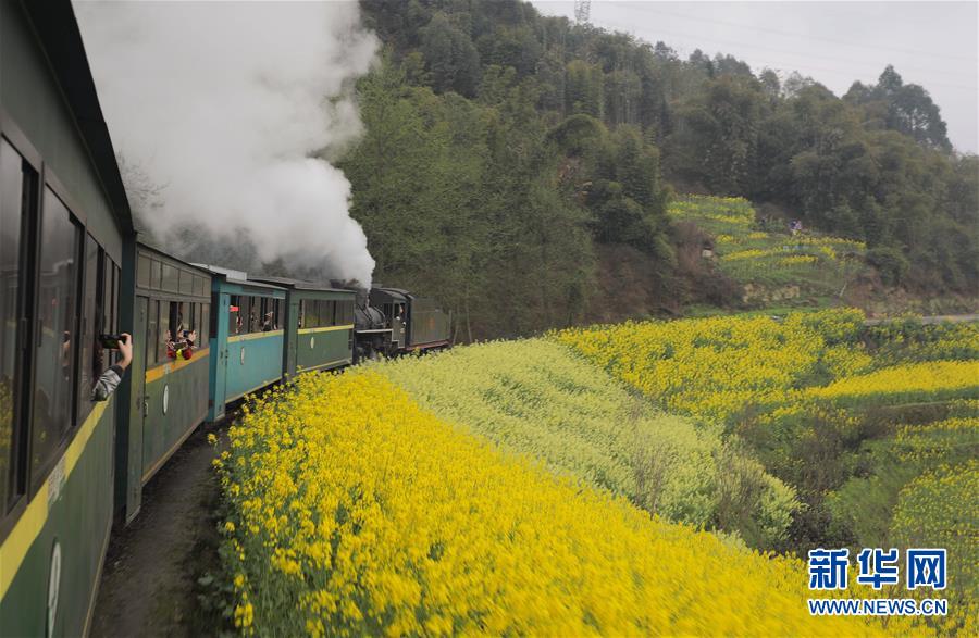 3月20日,乘坐嘉陽小火車的游客在拍攝風景。