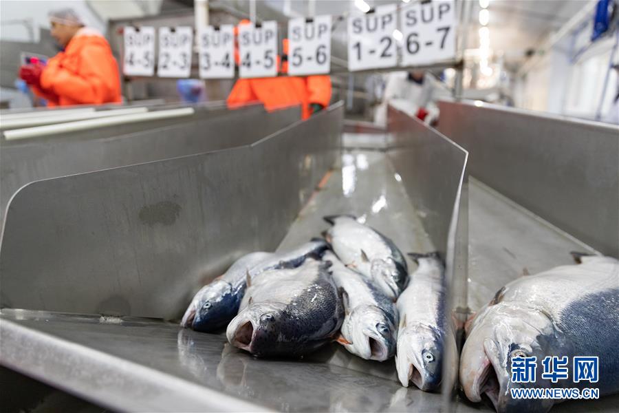 這是9月13日在位于俄羅斯摩爾曼斯克的俄羅斯水產養(yǎng)殖公司車間內拍攝的分揀后的鮭魚。 新華社記者白雪騏攝
