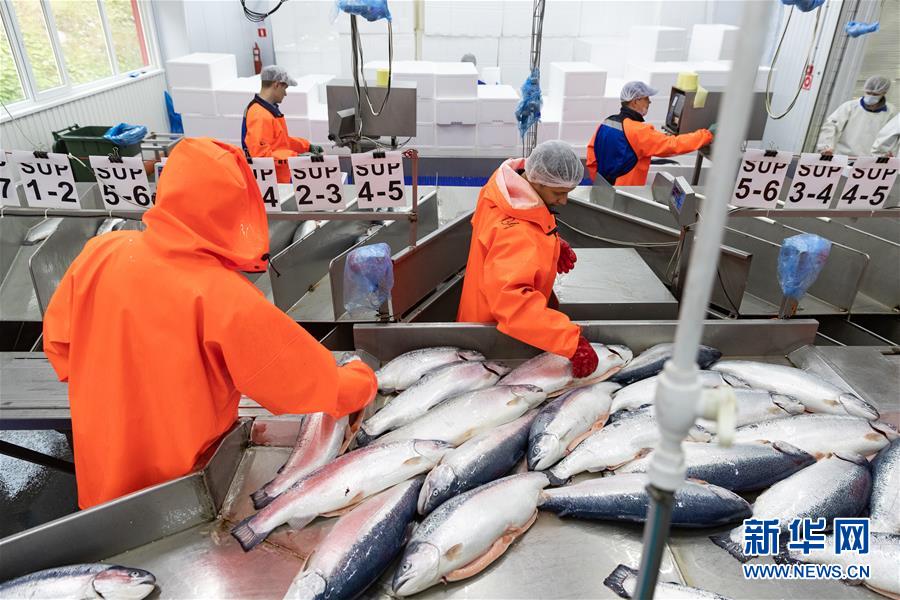9月13日,在俄羅斯摩爾曼斯克,俄羅斯水產(chǎn)養(yǎng)殖公司工作人員在車間處理鮭魚。 新華社記者白雪騏攝