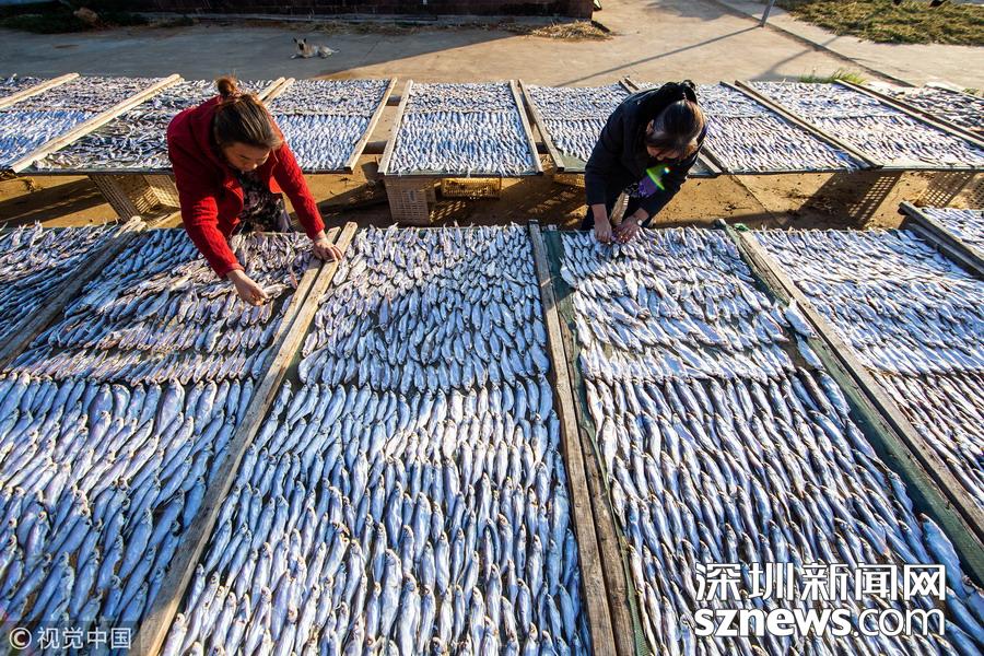 連日來(lái),秋風(fēng)颯爽,艷陽(yáng)高照,當(dāng)?shù)貪O村迎來(lái)豐收季,漁民們?cè)谯蛾?yáng)湖畔的漁港岸邊和屋前屋后晾曬魚(yú)蝦,忙的不亦樂(lè)乎。