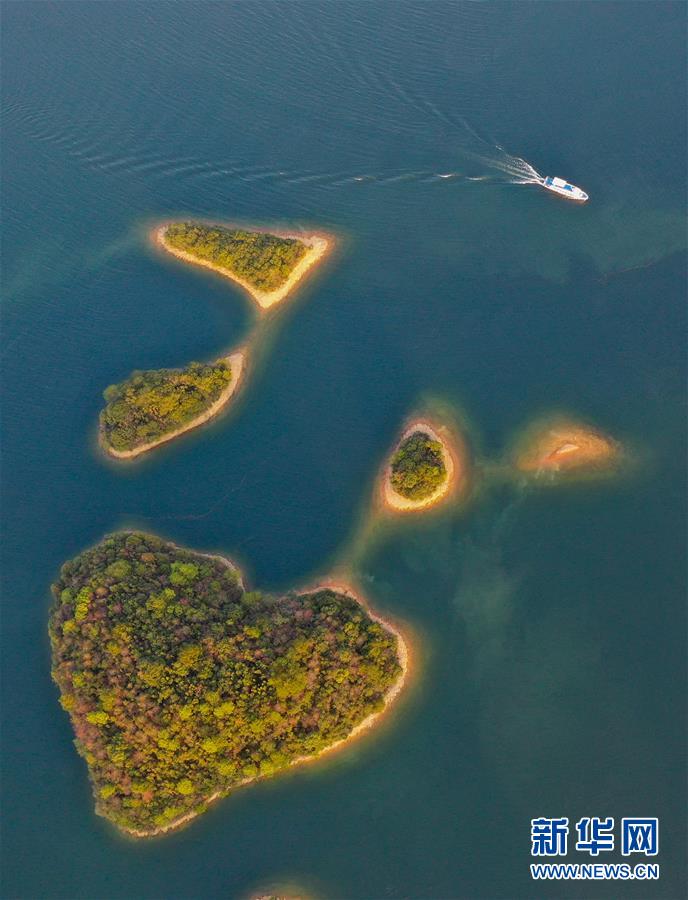 11月9日無人機(jī)拍攝的廬山西海。 當(dāng)日,落日余暉下的江西廬山西海山青水藍(lán),美不勝收。 新華社記者 周密 攝