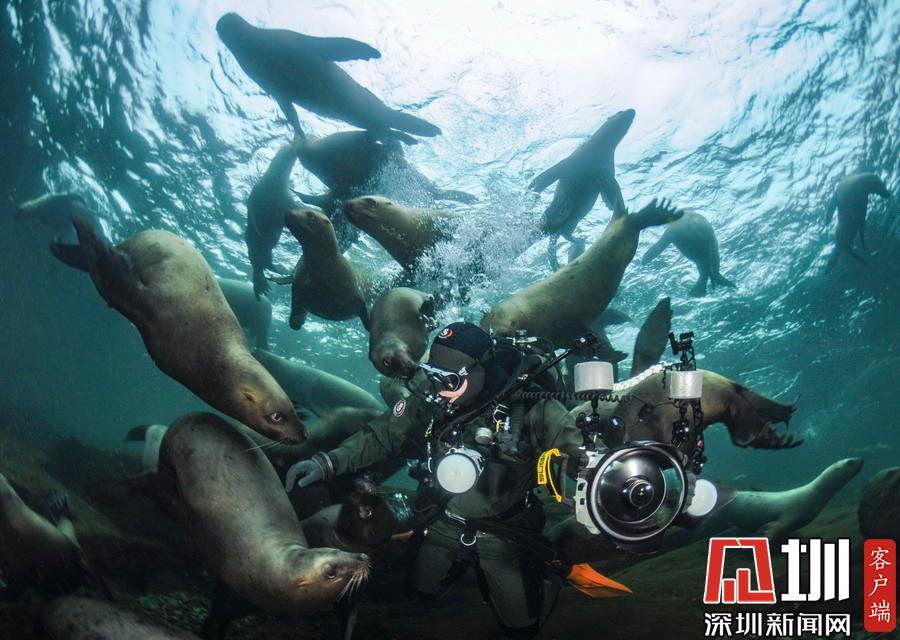 32歲的 Maxwel Hohn是一名水下攝影師,日前,他潛入加拿大溫哥華海域,沒想到撞見海獅“大軍”,這50來只家伙對于 Maxwel的出現興奮不已,立刻將他團團圍住,仿佛進了盤絲洞。