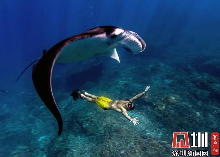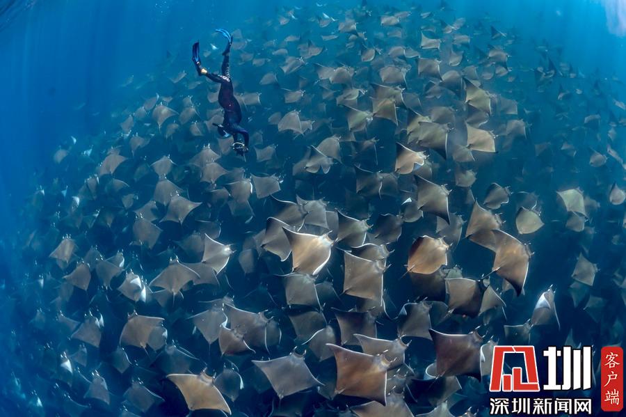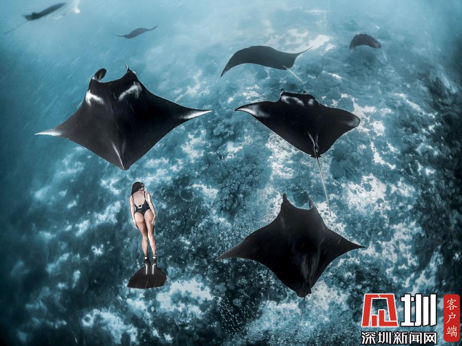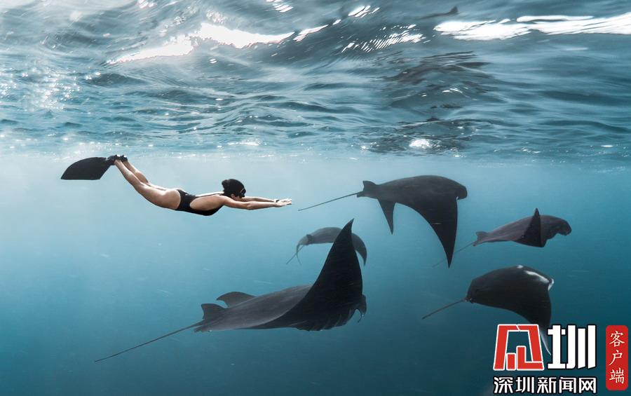 2019年7月2日報道(具體拍攝時間不詳),印度尼西亞科莫多國家公園,美國自由潛水愛好者Kristina Zvaritch一次潛水時,她的正下方恰巧游著幾只巨大的蝠鲼,這令人驚艷的一幕恰巧被她的丈夫拍下來了。當她看到這些照片時,自己都被驚呆了。晶瑩剔透的海水使這張照片有了視覺錯位的效果,讓人以為Kristina與這些魚處于相同的高度,但實際上她離這些魚還有10-19英尺左右的距離。