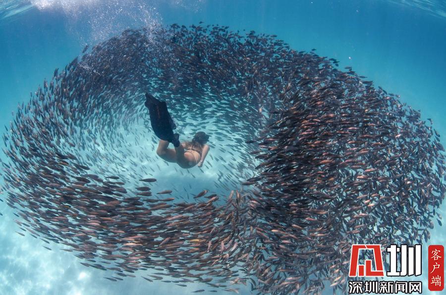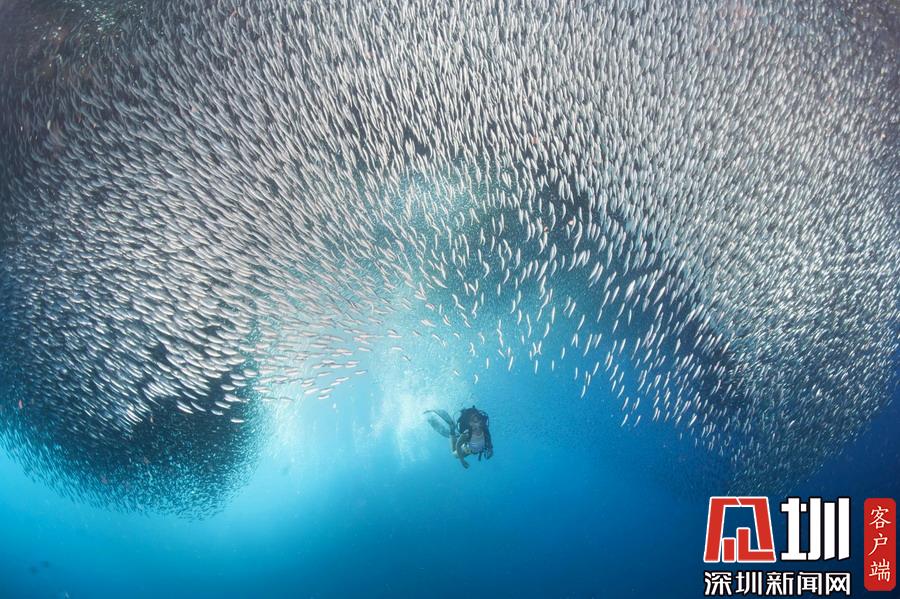 2018年12月24日報道(具體拍攝時間不詳),這張驚艷的照片記錄了沙丁魚大軍為一位幸運的潛水員讓路的瞬間,數百萬條銀光閃閃的小魚兒簇擁圍繞在他的一側,恰似熠熠生輝的繁星,如眾星捧月一般畫面十分驚艷。