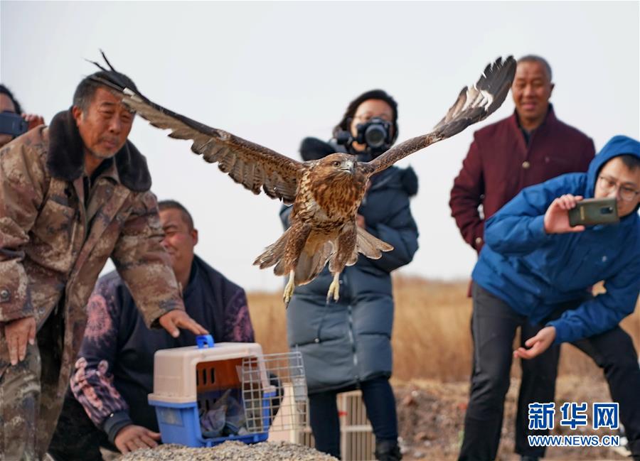 11月16日,在樂亭縣野生動(dòng)物保護(hù)協(xié)會(huì)大清河鳥類救助站,工作人員放飛一只普通鵟。新華社記者楊世堯攝
