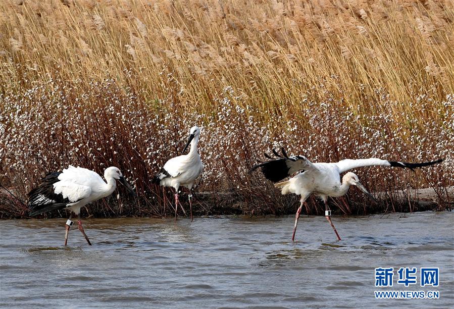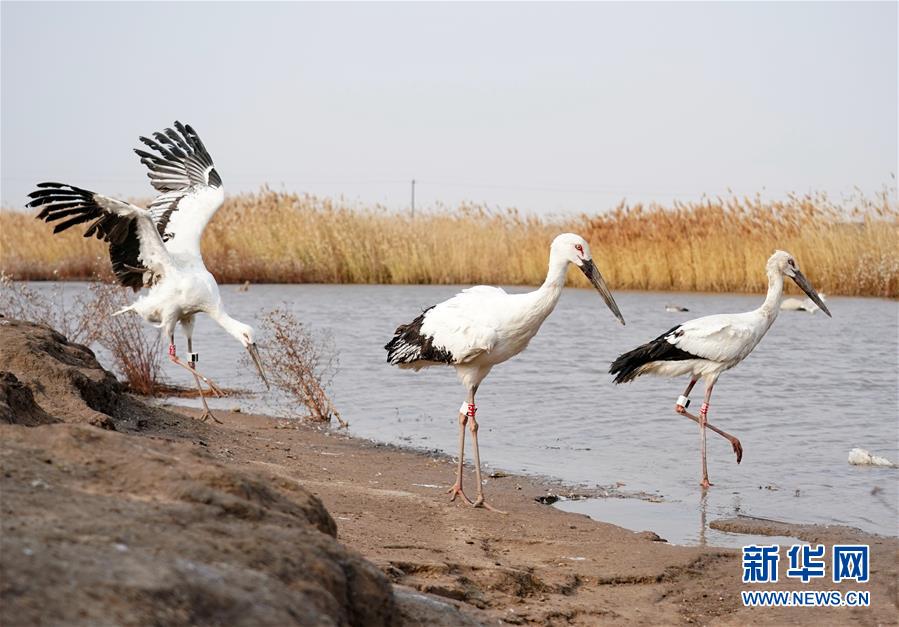這是在樂亭縣野生動(dòng)物保護(hù)協(xié)會(huì)大清河鳥類救助站放飛回歸大自然的三只國家一級(jí)保護(hù)動(dòng)物東方白鸛(11月16日攝)。新華社記者楊世堯攝