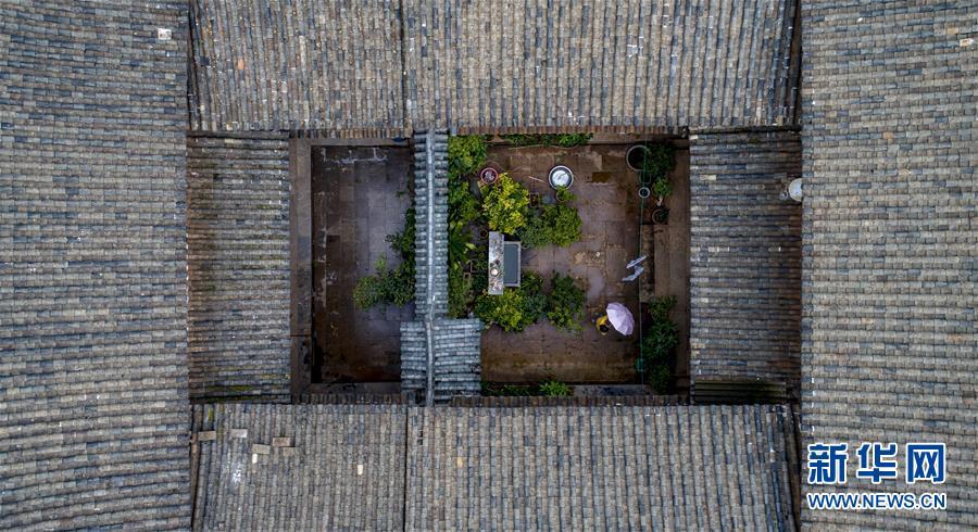 11月14日,埭美村村民在修繕一座古民居(無(wú)人機(jī)拍攝)。新華社記者姜克紅攝