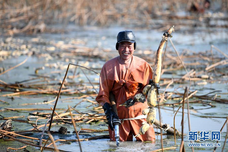 11月18日,工人在采收蓮藕。初冬時(shí)節(jié),河北省唐山市曹妃甸蓮藕豐收,工人們?cè)诮Y(jié)冰之前忙著采收蓮藕。新華社記者邢廣利攝