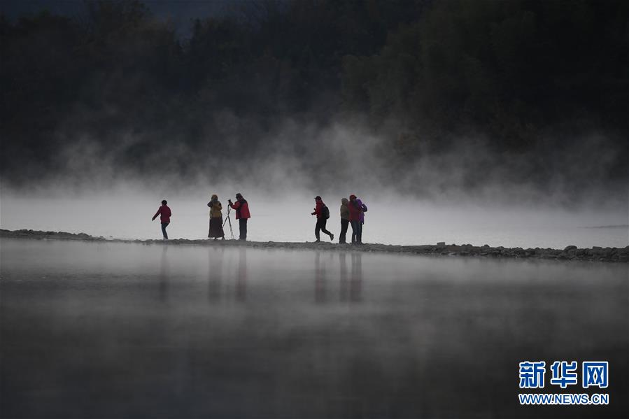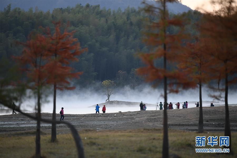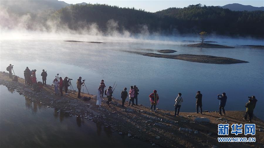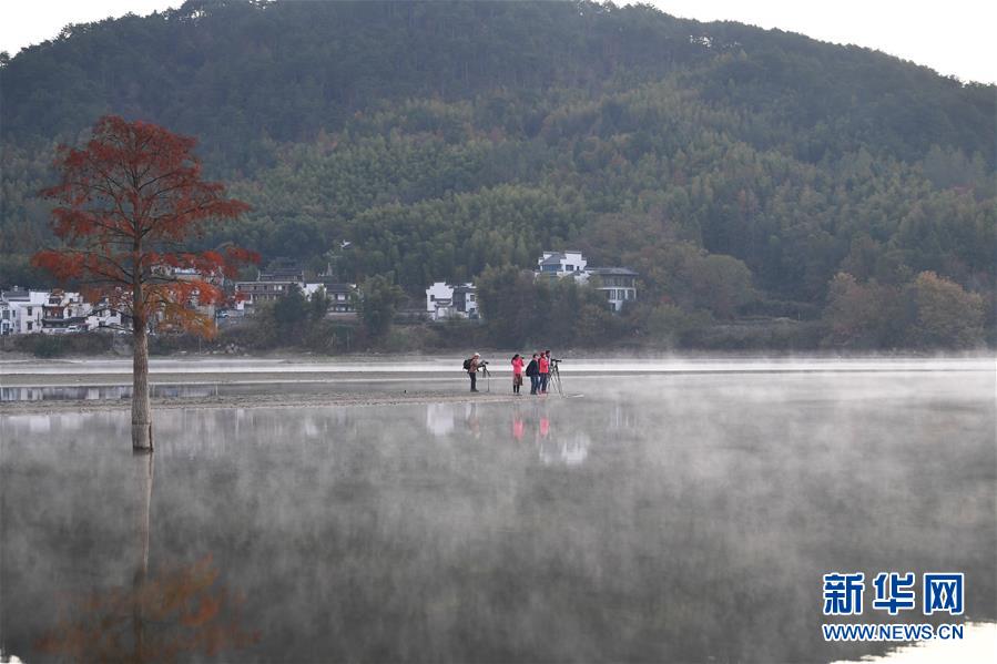 11月14日,游客在奇墅湖邊拍攝風光。 初冬時節(jié),安徽省黃山市黟縣奇墅湖晨霧縹緲,別具韻味。新華社記者劉軍喜攝