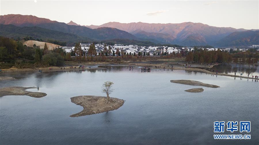 11月14日拍攝的安徽黟縣奇墅湖晨景(無人機航拍)。新華社記者張笑宇攝