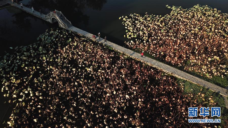 11月14日,游客在奇墅湖邊拍照(無人機拍攝)。新華社記者張端攝