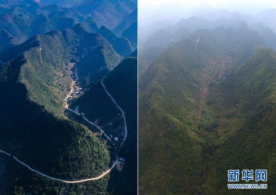 拼版照片:左圖為剛剛修通水泥路的大化瑤族自治縣板升鄉(xiāng)八好村弄研屯(11月11日無(wú)人機(jī)拍攝);右圖為尚未通路的八好村弄研屯(2015年11月3日無(wú)人機(jī)拍攝)。新華社記者黃孝邦攝