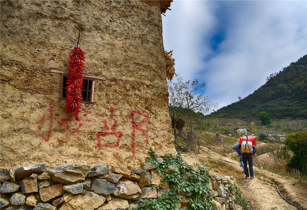 2019年11月16日,四川涼山,楊陽(yáng)背著快遞行走在村里,路過(guò)村上才開的小賣部。