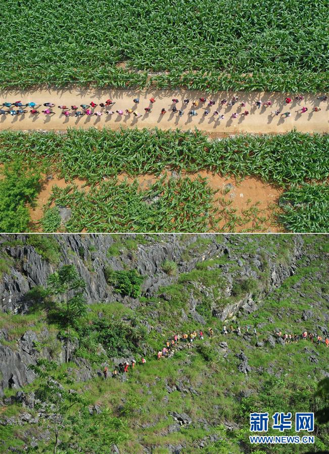拼版照片:上圖為在大化瑤族自治縣板升鄉(xiāng)弄勇村,孩子們走在放學(xué)路上(5月10日無(wú)人機(jī)拍攝);下圖為在弄勇村弄頂屯,孩子們扛著生活用具,走山路回家(2012年7月4日攝)。新華社記者黃孝邦攝