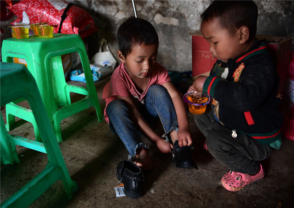 2019年11月16日,四川涼山,回到家,楊陽的女兒楊英(左)就迫不及待地試穿新鞋。