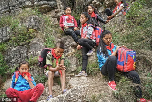 上學的孩子都背著沉沉的書包,大多數(shù)是女孩,15個孩子在三個家長的保護下,大約用了2個小時,到達“懸崖村”。上山容易下山難,遇到雨雪天氣,村里人就不再外出了。圖片來源:視覺中國