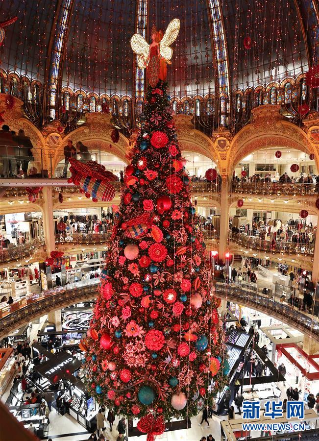 這是11月24日在法國巴黎老佛爺百貨公司拍攝的點燈后的巨型圣誕樹。 新華社記者高靜攝