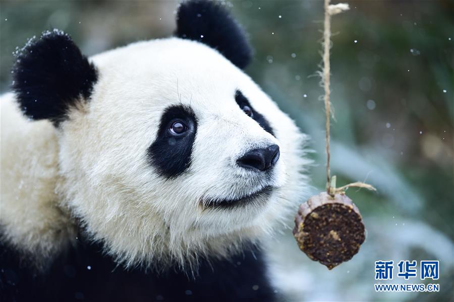11月29日,在西寧熊貓館內(nèi),一只大熊貓望向飼養(yǎng)員投送的食物。 新華社記者 吳剛 攝