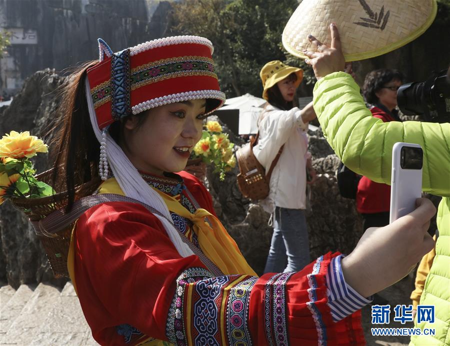 游客在石林景區(qū)身著民族服飾自拍(11月27日攝)。新華社記者蘭紅光攝