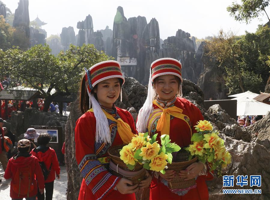 游客在石林景區(qū)身著民族服飾拍照留念(11月27日攝)。新華社記者蘭紅光攝