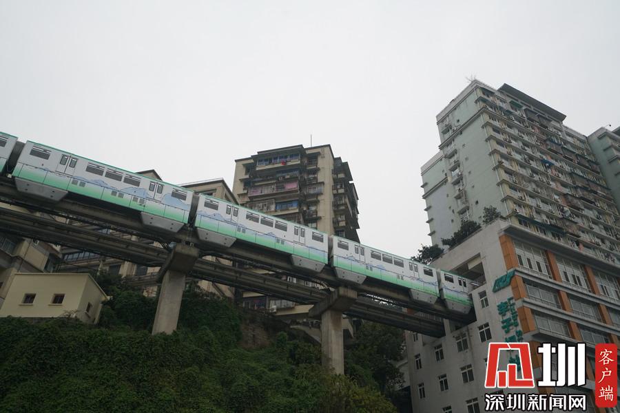 2019年6月25日,重慶渝中區(qū),軌道交通2號(hào)線列車從一小區(qū)的6層“螺旋”停車場上方穿過,顯得十分“魔幻”。圖為高處拍攝的軌道交通2號(hào)線。