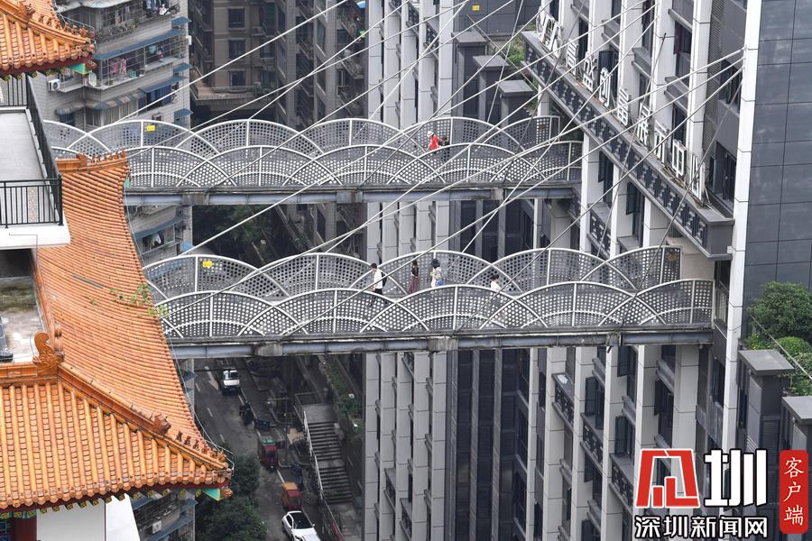 2018年4月11日,重慶市渝中區(qū)東營街,一座人行天橋離地40米,在半空中呈“S型”繞樓而過,好似一條飛揚(yáng)的絲帶。該天橋橋面寬約2米,長約70米,連接大陽溝派出所和鑫龍大廈的13樓,中間僅靠一根水泥墩支撐。