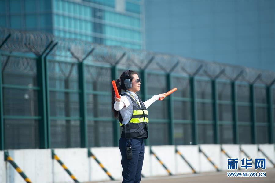 11月25日,澳門國際機場營運員鄧祺君在機場指揮飛機停泊,她已經(jīng)工作了3年。 新華社記者 張金加 攝