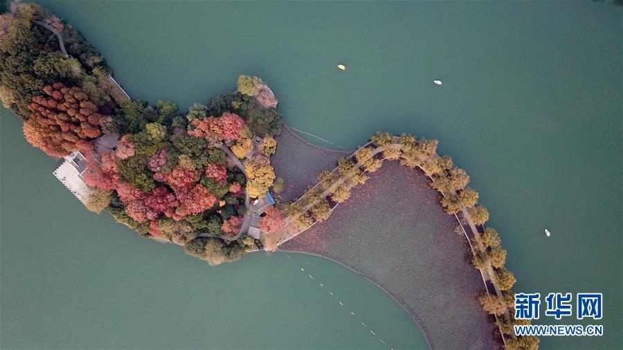 12月10日,小船在湖南烈士公園年嘉湖湖面行駛(無人機(jī)拍攝)。新華社記者陳澤國攝