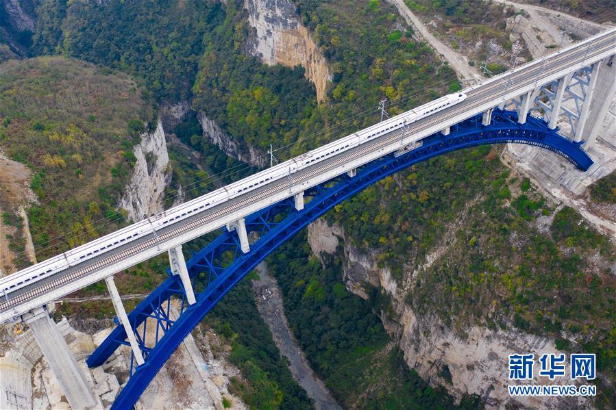 12月2日,一輛試驗列車駛過成貴高鐵鴨池河特大橋。當(dāng)日,正在進行聯(lián)調(diào)聯(lián)試的成貴高鐵進入全線拉通空載模擬運行階段,試驗列車將在成都到貴陽區(qū)間內(nèi)全線路運行。線路全長650公里的成貴高鐵是我國“八縱八橫”高速鐵路網(wǎng)的重要組成部分,設(shè)計時速為250公里。新華社記者劉續(xù)攝