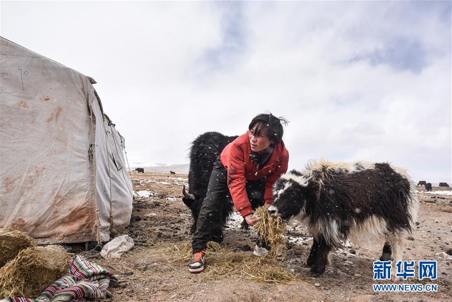 2月22日,才巴拉加在麥雄灘的帳篷前給牛犢喂飼料。今年年初,青海省玉樹(shù)藏族自治州遭遇重度雪災(zāi),部分地區(qū)積雪深度超過(guò)半米,牲畜覓食困難,餓死凍死超2萬(wàn)頭只。麥雄灘位于巴顏喀拉山腳下的玉樹(shù)藏族自治州稱多縣清水河鎮(zhèn)文措村,是此次玉樹(shù)雪災(zāi)中化雪較快、接納受災(zāi)轉(zhuǎn)場(chǎng)外地牧民最多的地點(diǎn)之一。文措村黨支部書(shū)記白尕召集村民開(kāi)會(huì),大家一致同意拿出30萬(wàn)畝草場(chǎng),供受災(zāi)更嚴(yán)重的其他地區(qū)牧民使用。新華社記者吳剛攝