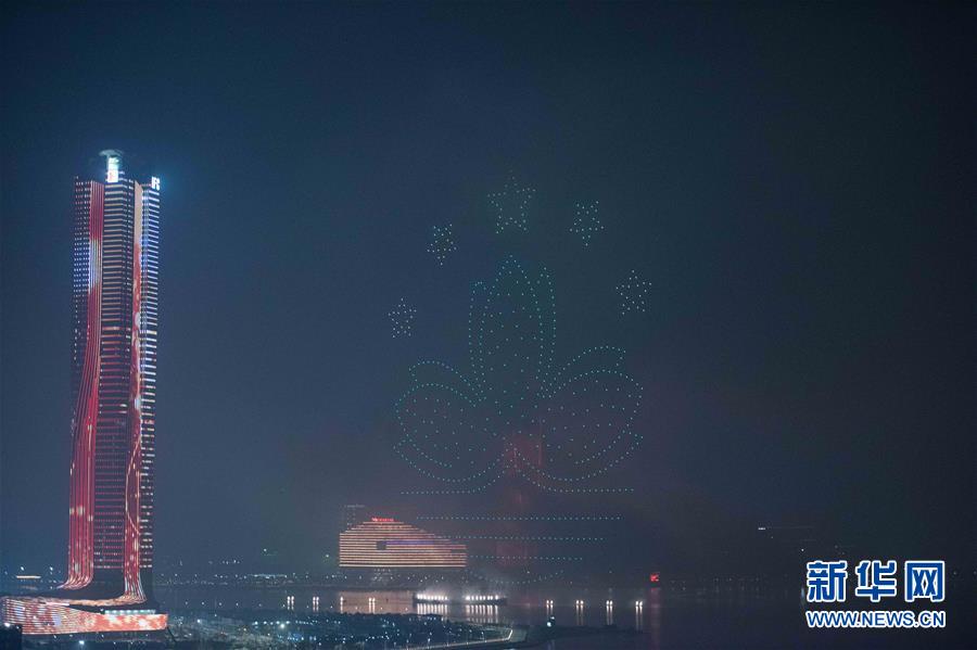 12月22日拍攝的煙花匯演上的無人機(jī)表演。當(dāng)晚,澳門與珠海首次聯(lián)合舉行煙花匯演,慶祝澳門回歸祖國(guó)20周年。新華社記者張金加攝