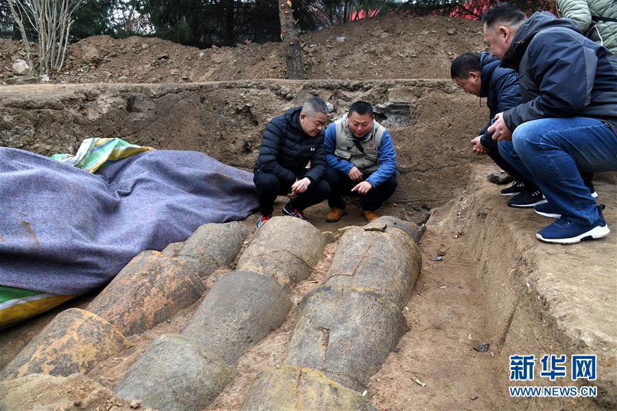 考古隊(duì)員(左二)在瑯琊臺遺址考古發(fā)掘現(xiàn)場介紹陶水管的構(gòu)造和結(jié)構(gòu)(12月21日攝)。新華社記者李紫恒攝