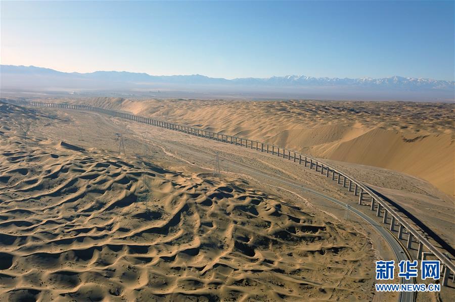 這是敦格鐵路沙山溝特大橋(12月11日無人機(jī)拍攝)。 敦(煌)格(爾木)鐵路沙山溝特大橋位于甘肅省酒泉市阿克塞哈薩克族自治縣境內(nèi)的庫姆塔格沙漠內(nèi),是一座穿越活動(dòng)性沙漠地區(qū)的特長橋梁,也是敦格鐵路的重難點(diǎn)控制工程。據(jù)介紹,橋梁所在區(qū)域風(fēng)沙活動(dòng)頻繁,四季及晝夜溫差大,在建設(shè)過程中,中鐵十一局集團(tuán)有限公司的建設(shè)者根據(jù)沙層的厚度、分布及含水率的不同,總結(jié)出一套沙丘樁基施工工藝。 新華社記者 范培珅 攝