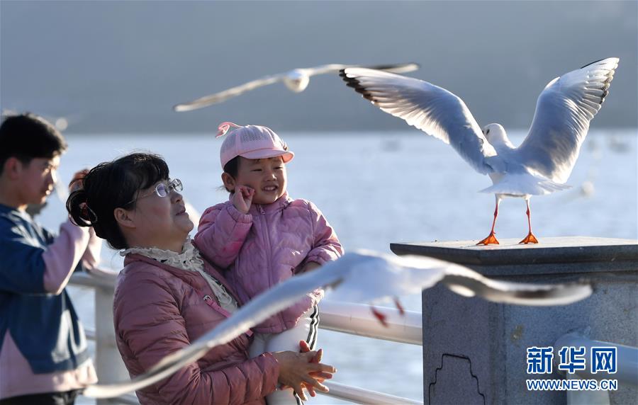 12月18日,人們?cè)诶ッ骱9〈髩斡^賞、投喂紅嘴鷗。 近日,“春城”昆明陽光明媚,氣候宜人,市民游客紛紛來到海埂大壩、翠湖公園等地,與前來越冬的紅嘴鷗近距離接觸,人鷗同樂。紅嘴鷗是云南昆明的“榮譽(yù)市民”,每年秋冬季都會(huì)來到昆明越冬。 新華社記者 藺以光 攝