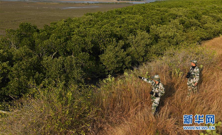 海南儋州新英灣紅樹林市級自然保護(hù)區(qū)護(hù)林員陳正平(前)和同伴巡護(hù)保護(hù)區(qū)內(nèi)的紅樹林(12月9日攝)。陳正平2010年開始在保護(hù)區(qū)工作,他將工作發(fā)展成愛好,廣泛參加各種培訓(xùn)和業(yè)內(nèi)交流。他在工作中拍到瀕危鳥類白肩雕出現(xiàn)在海南的照片,這刷新了海南省的鳥種記錄。新華社記者楊冠宇攝